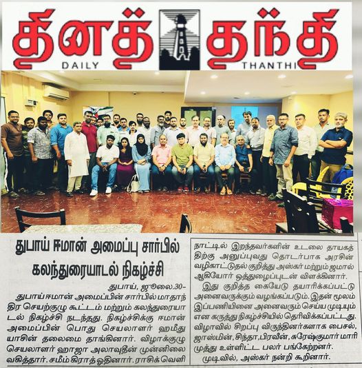 #Events #News துபாய் ஈமான் IMAN Media01 / 2 years 0 0 min read துபாய் ஈமான் அமைப்பின் சார்பில் கலந்துரையாடல் மற்றும் இறந்தவர்களின் உடலை தாயகத்திற்கு அனுப்புவது குறித்து வழிகாட்டுதல் நிகழ்ச்சி. Share: